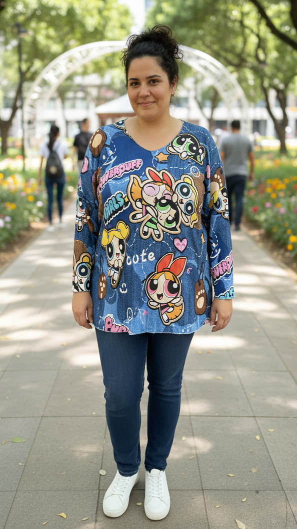 La Camiseta Olivia es pura actitud y diversión. Con un vibrante estampado inspirado en la estética de las Supernenas y el estilo denim, esta prenda es ideal para quienes buscan un look juvenil, desenfadado y lleno de personalidad. Su diseño holgado garantiza comodidad absoluta sin renunciar a la tendencia más actual.